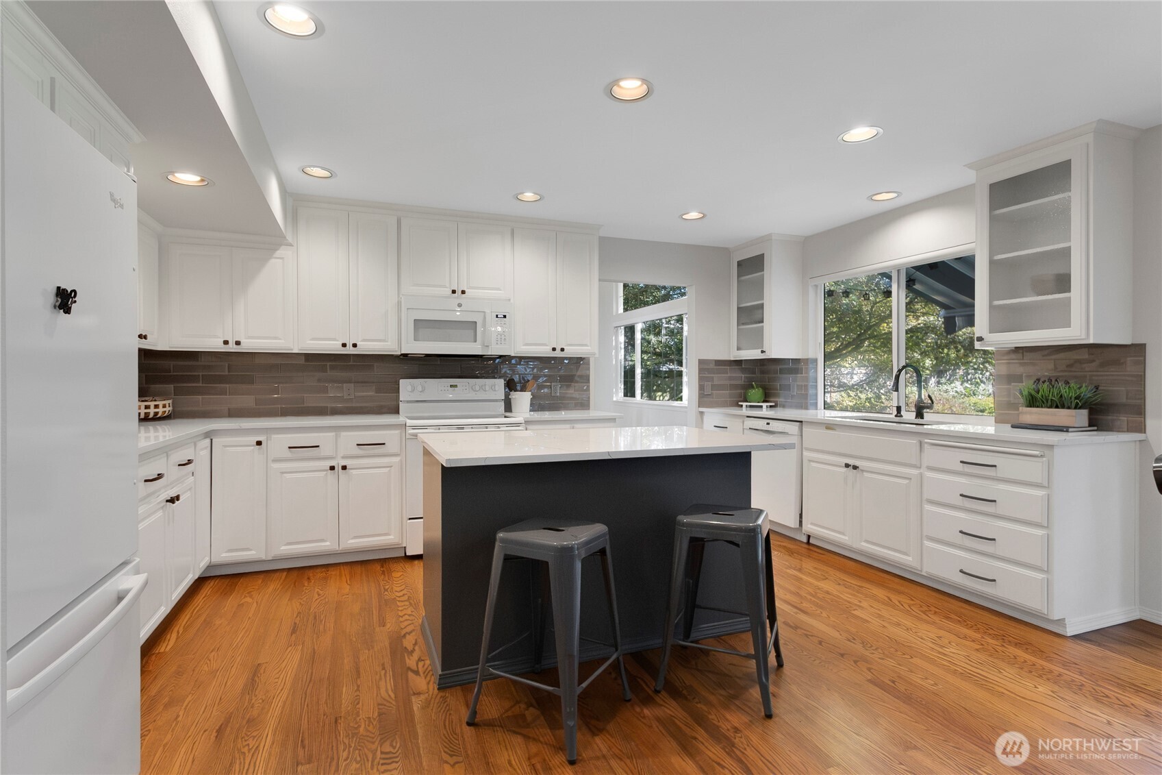 From the formal dining room, the kitchen is right at your fingertips. The kitchen, dining area, and family room provide everyday comfort, and the open layout is sure to inspire quality time with loved ones. In the well-appointed and updated kitchen, discover gorgeous quartz counters, an abundance of cabinetry storage, an island, and more. Don’t miss other thoughtfully curated details like the tile backsplash, black hardware, and frosted cabinetry doors, too!